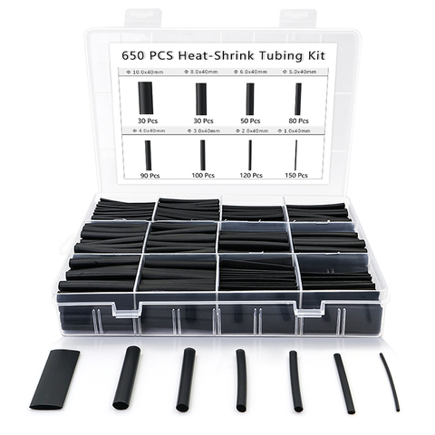 650PCS 2:1 Relación de contracción Kit de tubería termorretráctil negra impermeable para protección de aislamiento de cable eléctrico